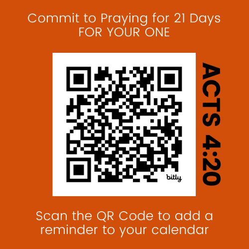 With a quick scan of this QR code you will be reminded to pray for that one person in your life that that God has placed on your heart that needs to know and have a personal relationship with Jesus.